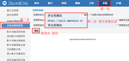 请按以下步骤进行:依次点击【采集】-【添加资源库】,然后依次输入